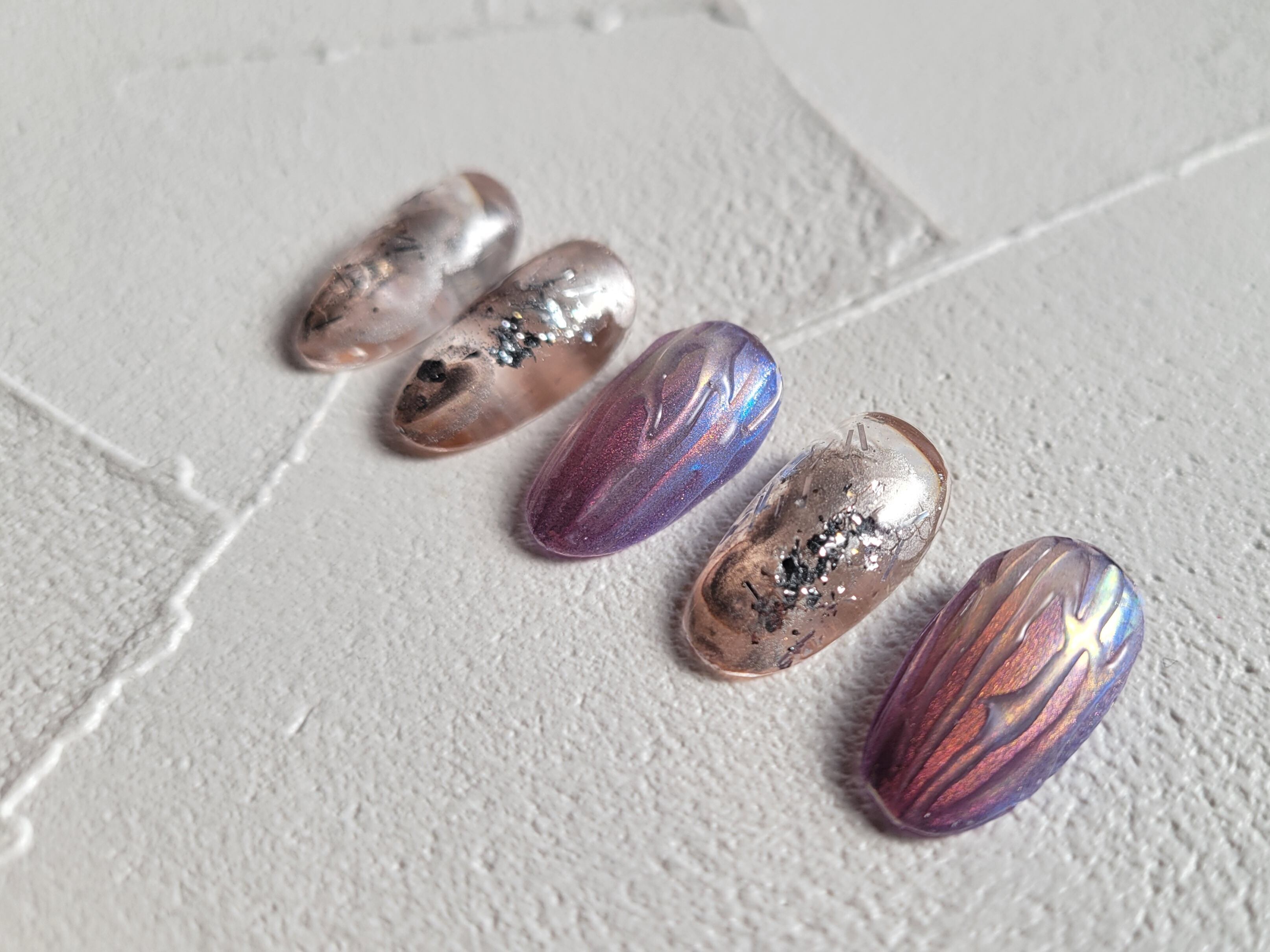 #ロングオーバル#ショートオーバル#春ネイル#zeroジェル#オーロラパウダー#幻想的#ゴールドミラー#形状記憶ジェルチップハンド#透明感デザイン#ピンクブルー#マグネット